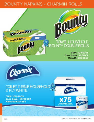 BOUNTY NAPKINS - CHARMIN ROLLS TOWEL HOUSEHOLD BOUNTY DOUBLE ROLLS CBI#: 10165263 Case Count: 12/82CT Manuf#: 9000855 TOILET TISSUE HOUSEHOLD 2 PLY WHITE CBI#: 10109005 Case Count: 75/450CT Manuf#: 9004584 229 COAST TO COAST FOOD BROKERS