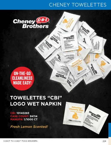 CHENEY TOWELETTES ON-THE-GO CLEANLINESS MADE EASY! TOWELETTES “CBI” LOGO WET NAPKIN CBI: 10140283 CASE COUNT: 94114 MANUF#: 1/1000 CT Fresh Lemon Scented! COAST TO COAST FOOD BROKERS 224